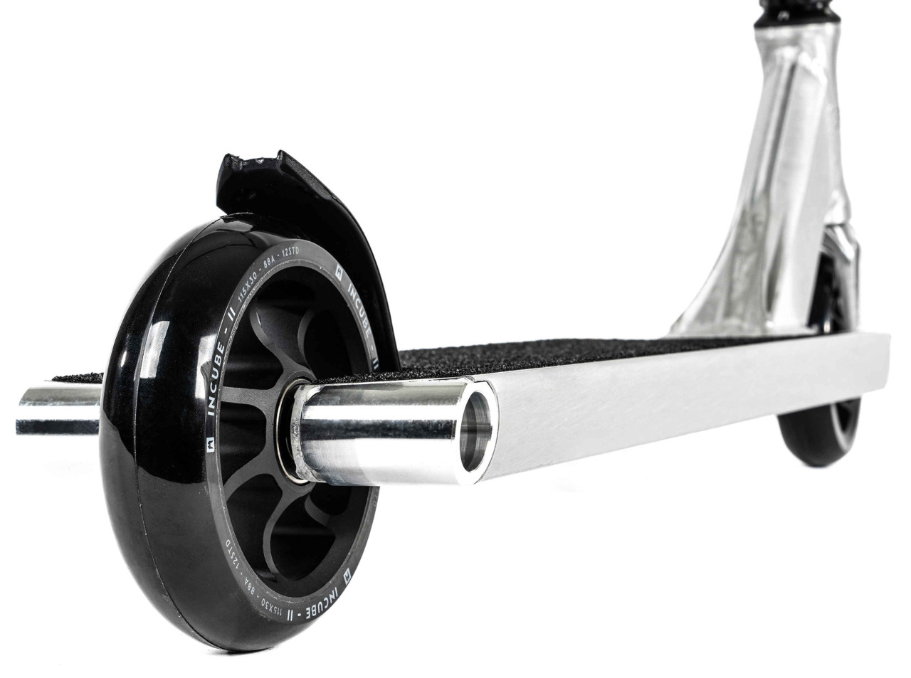 • Колеса Ethic Incube имеют прочную ось 12 мм, диаметр 115 мм и ширину 30 мм, что дает контроль на трюках с балансами на переднем и заднем колесе. При необходимости, можно перейти на меньший стандарт колес, 110 x 24, докупив ось 8 мм отдельно