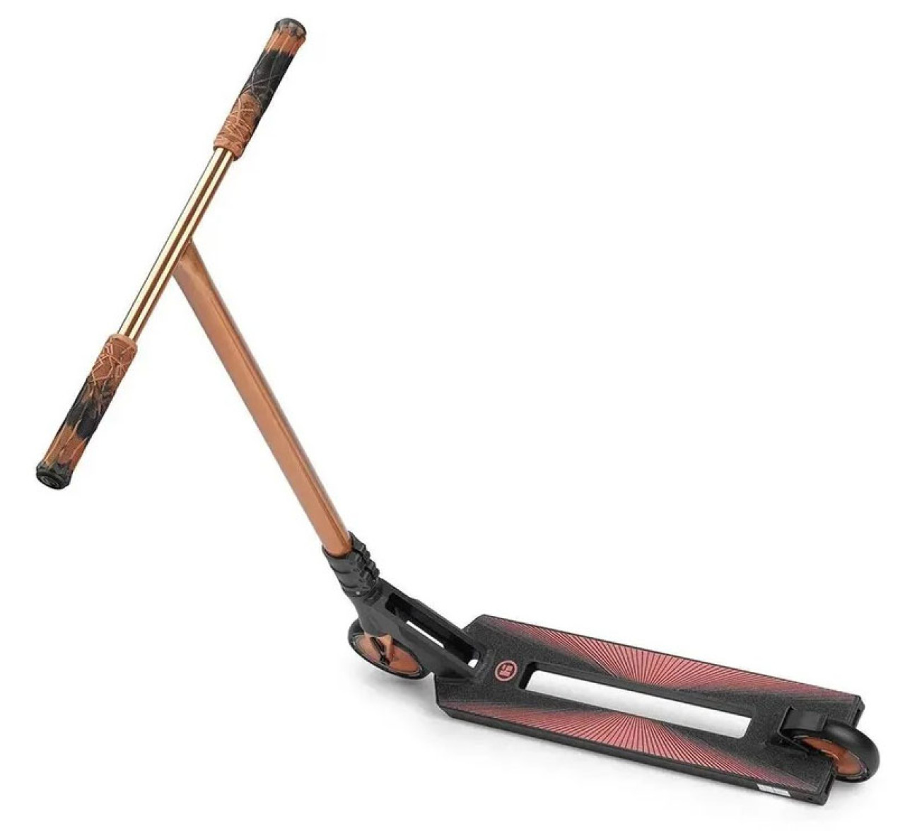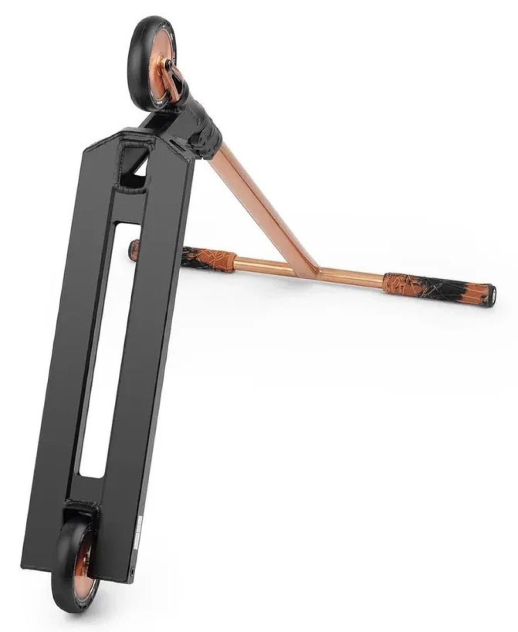 Данная модель самоката получила широкие, накатистые колеса диаметром 120 x 28 мм, с алюминиевым диском стандарта Hollowcore, что помогает сэкономить на весе не в угоду прочности. Руль выполнен из стали Cr-Mo, термообработан после сварки, имеет баттинг - переменную толщину труб в местах сосредоточения нагрузки, и Т-образную форму, что является каноном для стритового самоката. Руль и вилка на самокате фиксируется компрессией стандарта SCS увеличенного диаметра. Это позволит без проблем установить руль стандарта Oversized в будущем.