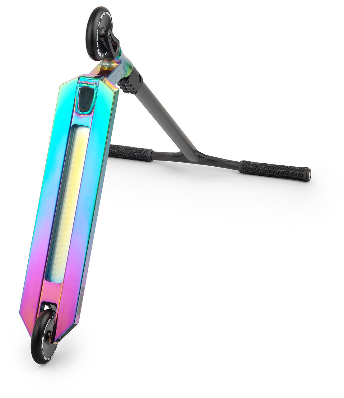 Легкость самоката кроется в деке и технических решениях в ней. Производитель оставил форму доски неизменной, при этом увеличив ее длину, и расширив эффективное пространство, что дает необходимый контроль при скольжениях и трюках с вращениями. Сама дека выполнена из алюминия, сплава 7005 Т6, легкого и прочного материала. Стоит заметить, что в данной модели профиль деки не идеально плоский, а имеет небольшие изгибы по бокам, что действительно важно в стрит-катании. Руль и вилка самоката выполнены из алюминия. Данное решение значительно уменьшает общий вес самоката без ущерба прочности.
