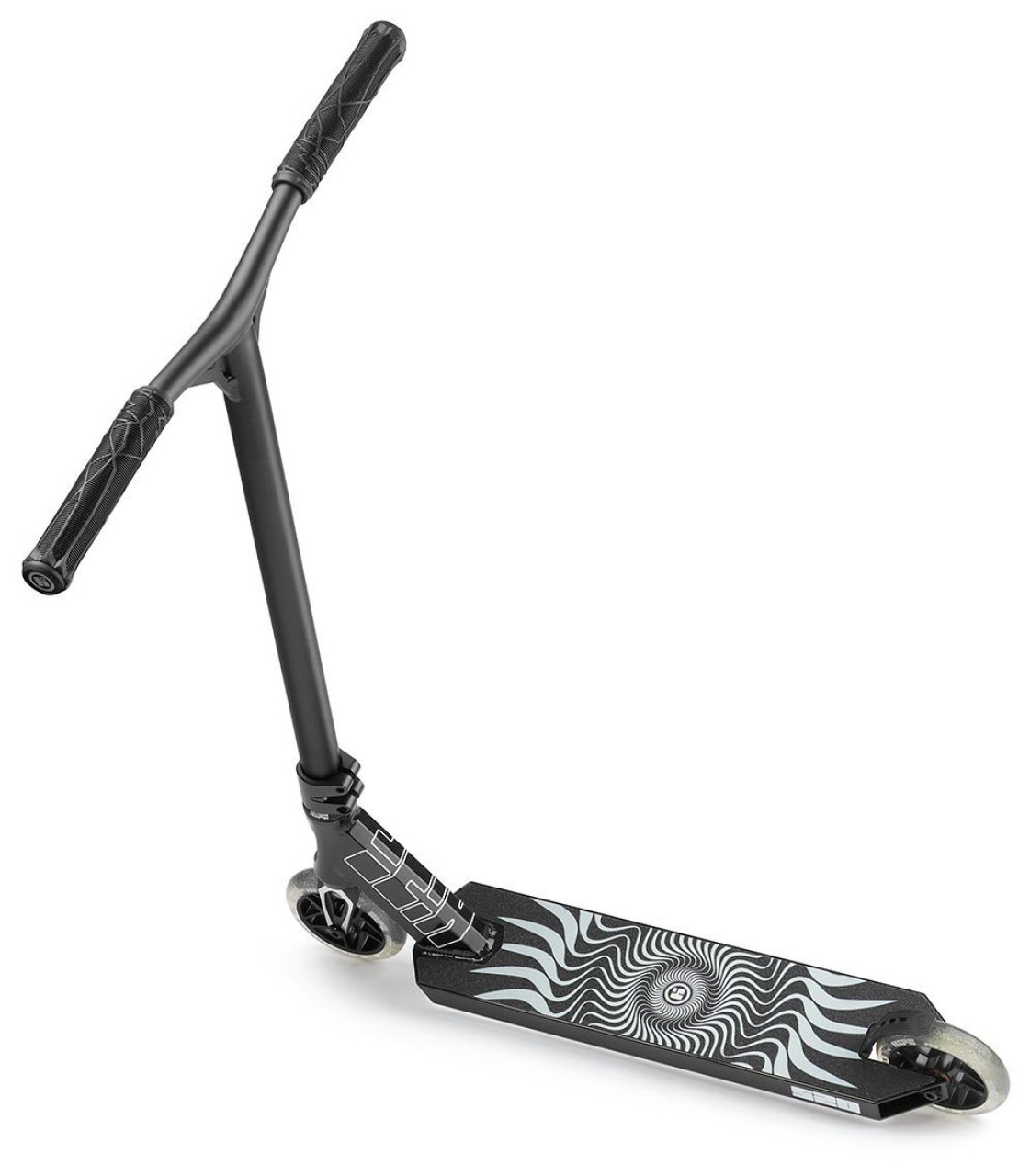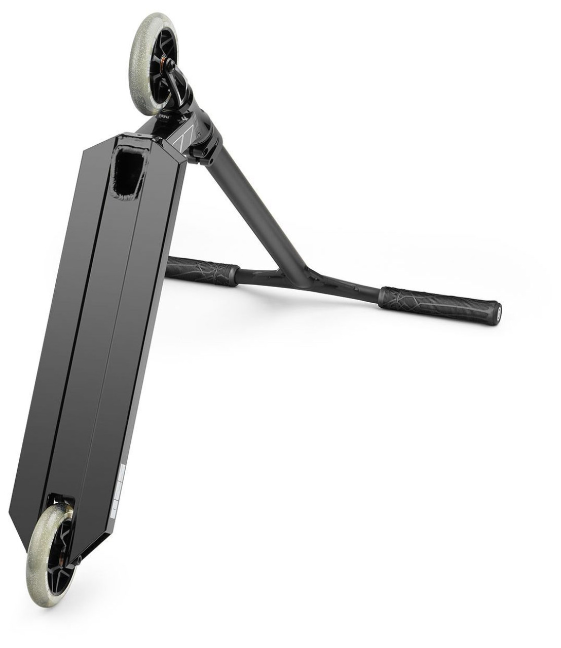 Руль самоката имеет Y-образную форму и выполнен из Cr-Mo стали - материала легкого, достаточно прочного. и устойчивого к коррозии. Дека выполнена из алюминия, сплава 7005 Т6. Стоит заметить, что в данной модели профиль деки не идеально плоский, а имеет небольшие изгибы по бокам, что действительно важно для комфортного приземления и выполнения трюков.