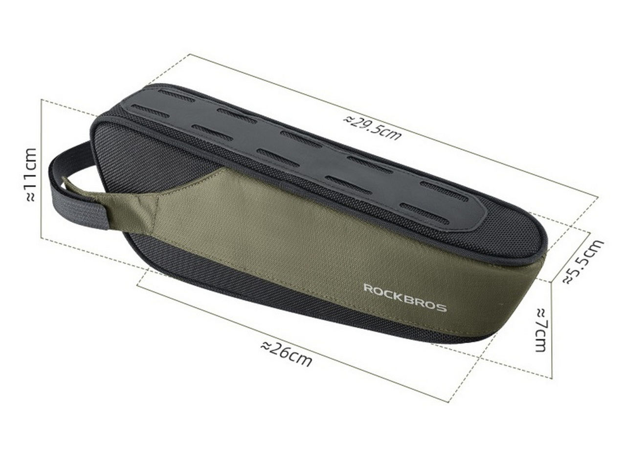 Сумка на раму 30120081001 от производителя Rockbros освободит вас от необходимости возить с собой поясную сумку и куда-то размещать вещи чтобы они не мешались в дороге. Данная сумка крепится на раму или под нее и имеет водонепроницаемый нейлоновый материал, благодаря которому все вещи сохранятся в сухости и чистоте. Установка происходит за счёт трех широких стреп на крепкой липучке за верхнюю трубу рамы и вокруг подседельной трубы, или рулевой колонки. Подойдет для любого направления велосипедов, включая шоссейные дисциплины. Объем сумки в 1,4 л позволяет разместить в себе все необходимые предметы. Выпускается данная сумка в красивом и практичном цвете хаки.