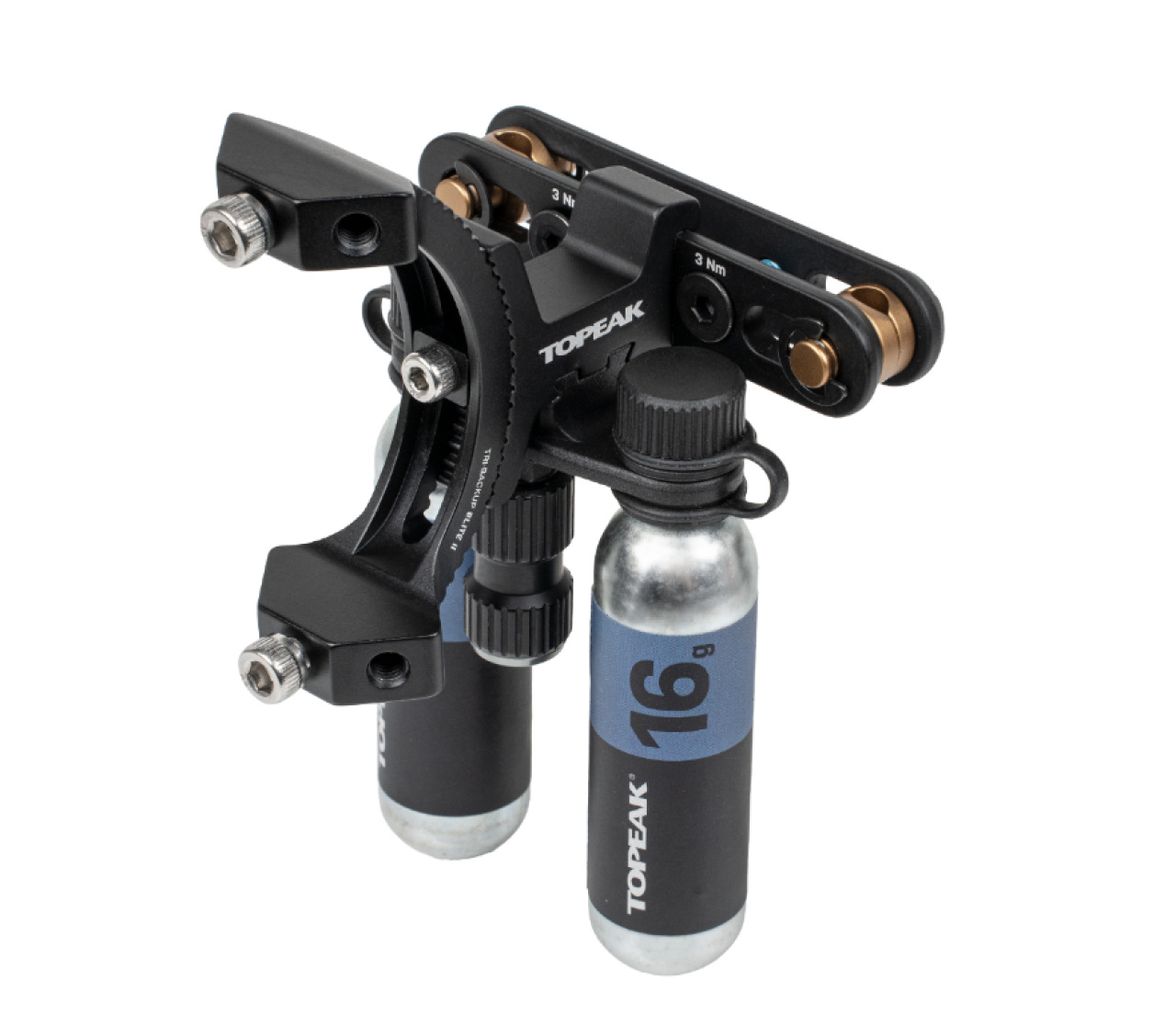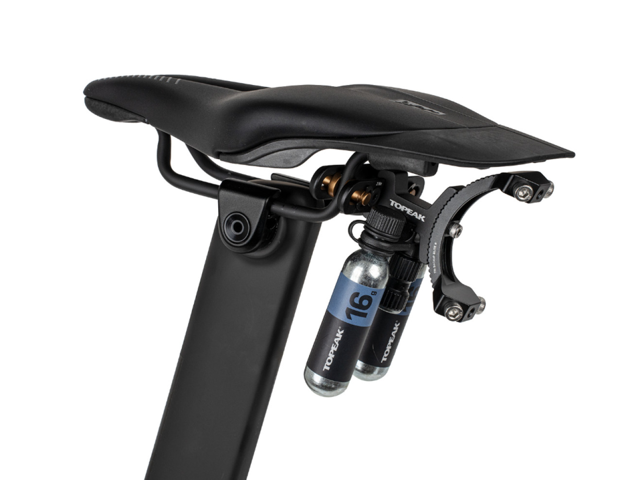 Tri-BackUp Elite 2 оснащен двумя креплениями под баллончики с C02 для быстрой подкачки покрышек, а также креплением для одной или двух фляг емкостью до 750 мл. Обновленная версия держателя оснащена направляющими с более широким диапазоном угла наклона, что позволит улучшить эргономику и быстро пользоваться прикрепленными аксессуарами прямо на ходу. Также, улучшения получил и флягодержатель. Теперь он имеет двойную резьбу, что препятствует проскальзыванию фляги внутри и дает более надежную фиксацию. Кроме этого, держатель оборудован дополнительным местом для крепления C02 насоса Topeak Micro Air Booster. Максимальная нагрузка составляет 2,5 кг.