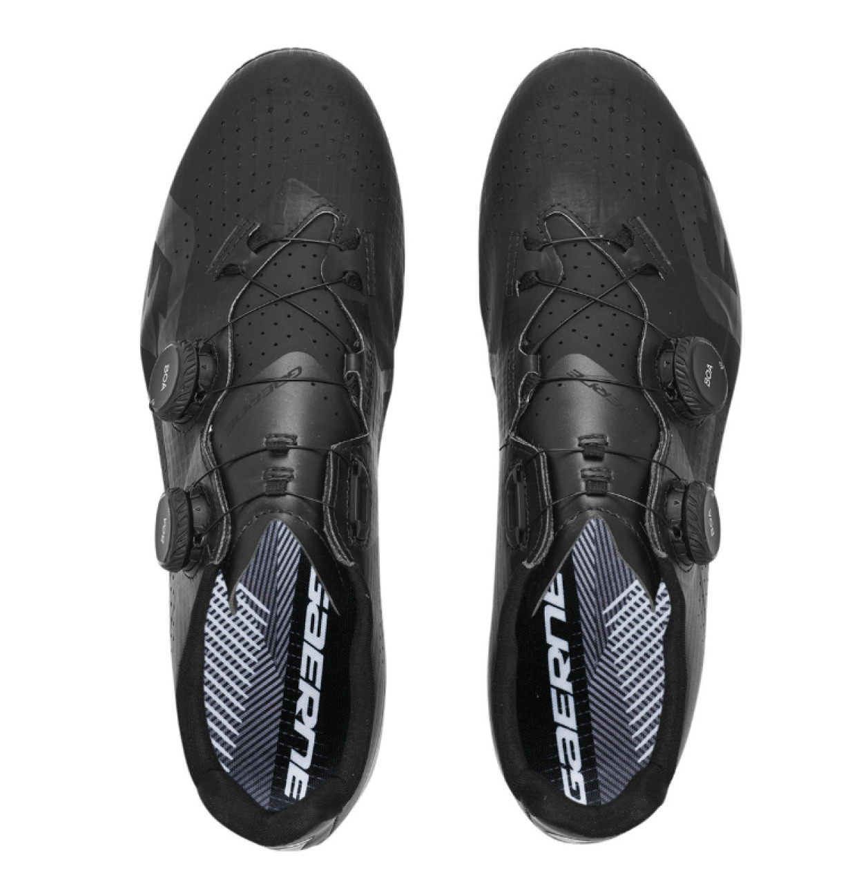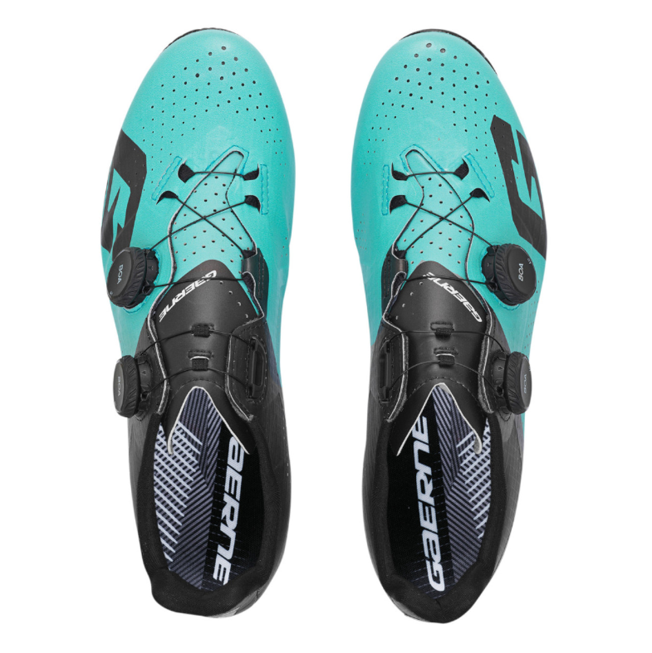 Эта модель включает в себя и язычок с бесшовной конструкцией Fit Tongue, который встречается и в других моделях обуви бренда Gaerne, имеющий дополнительный амортизирующий слой, обеспечивающий надежную посадку обуви на стопе. Данная обувь имеет анатомическую стельку и карбоновую подошву, имеющую максимальный, 12-ый уровень жесткости, что позволяет стопе фиксироваться на контактной педали, и предотвращает случайное выстегивание из нее.