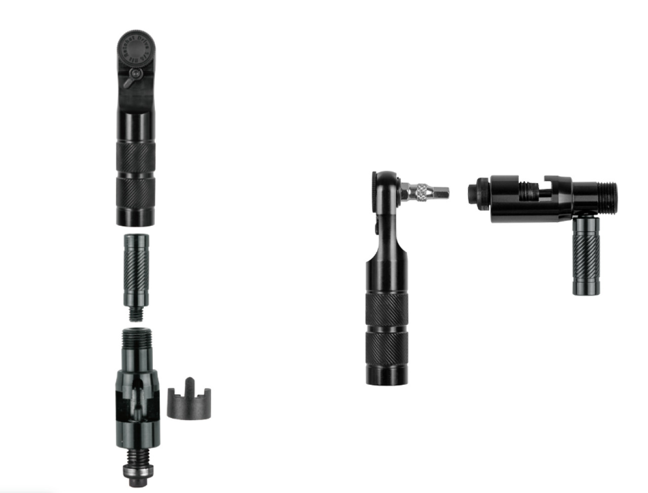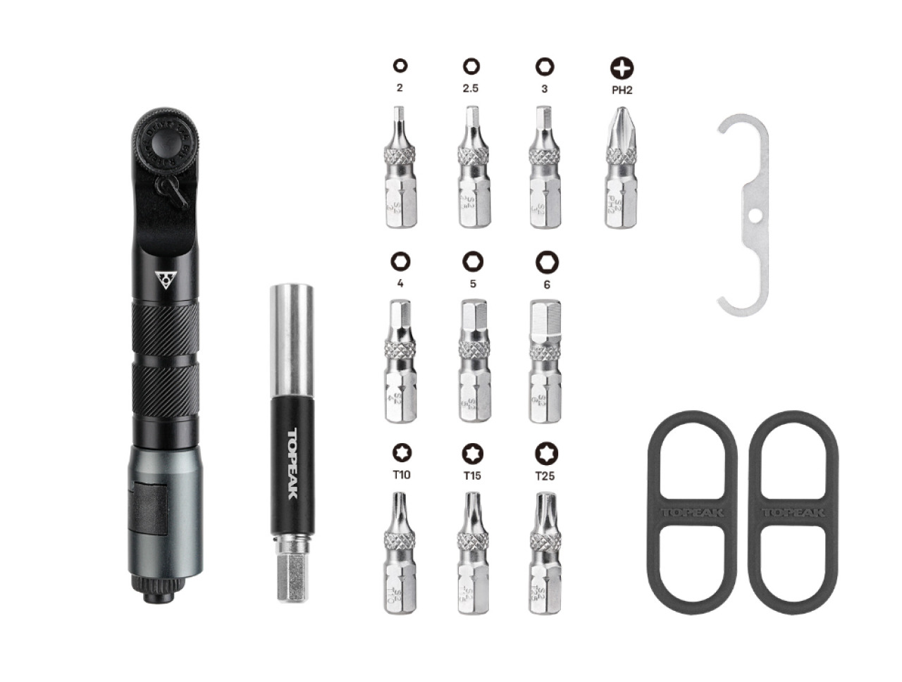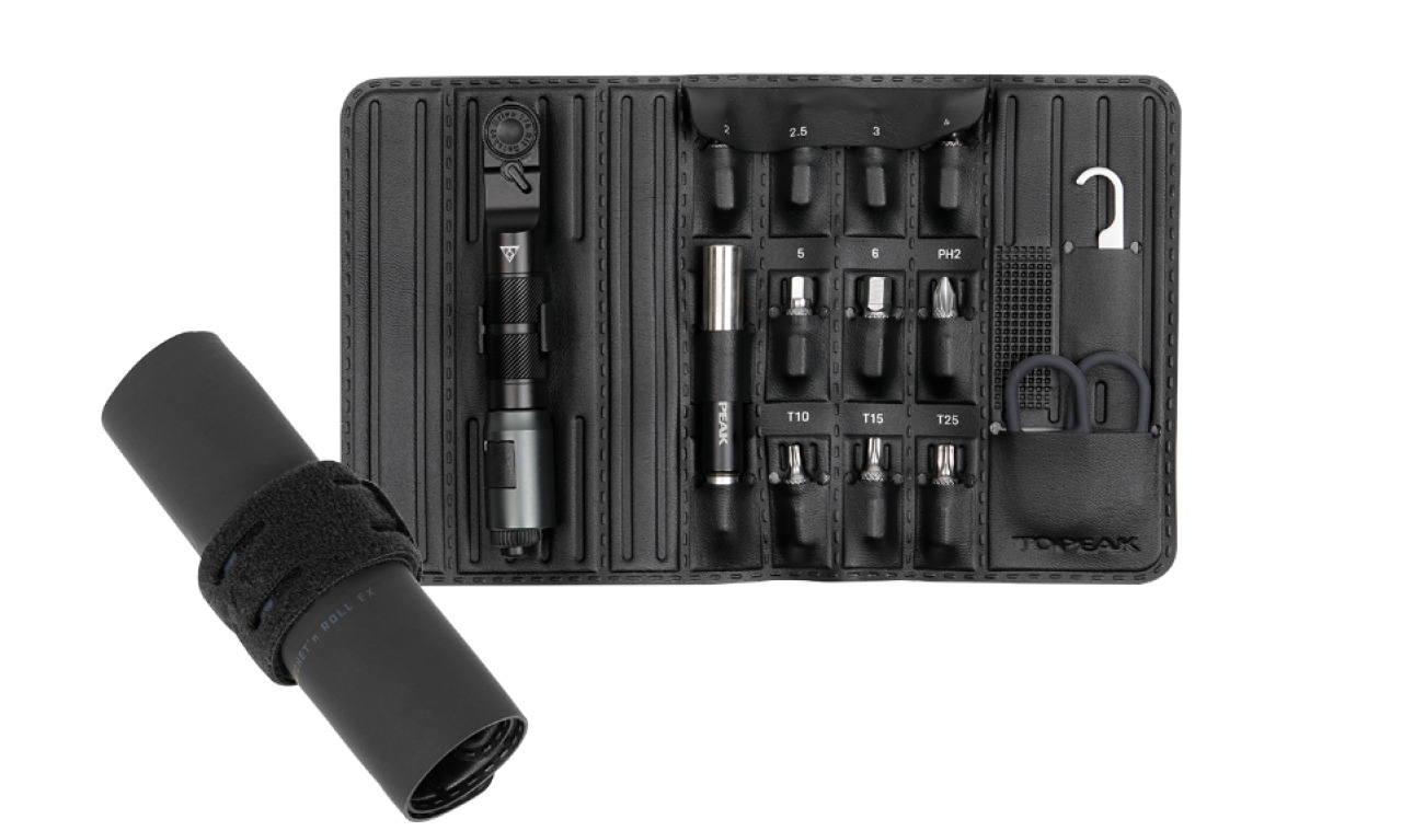 Набор инструментов с трещоткой Topeak Ratchet'n Roll EX оснащен храповым механизм с мелкими зубьями, рычаг реверса и колесо с рифлёной поверхностью для быстрого вращения и управления в труднодоступных местах. Также в комплекте есть держатель для бит с быстросъёмной втулкой, шестигранники размером 2, 2.5, 3, 4, 5, 6 мм, ключи Torx T10, T15, T25 , крестообразная бита, выжимка для цепи и крюк для цепи. Все инструменты аккуратно уложены в рулон, который надёжно закрыт с помощью ремня. В комплект также входит карман для хранения двух силиконовых ремешков. Эти приспособления созданы для транспортировки одного картриджа весом 16 грамм, содержащего углекислый газ для подкачки камер, а также двух монтажных элементов.